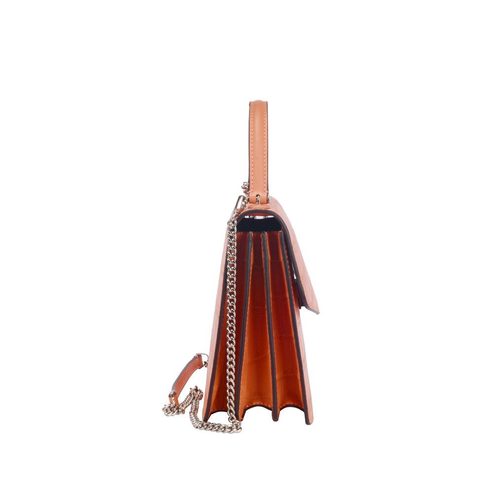 Smooth leather bag with short top handle. Includes a chain and leather cross body/ shoulder strap. Main compartment with flap buckle closure. Silver metal detailing.